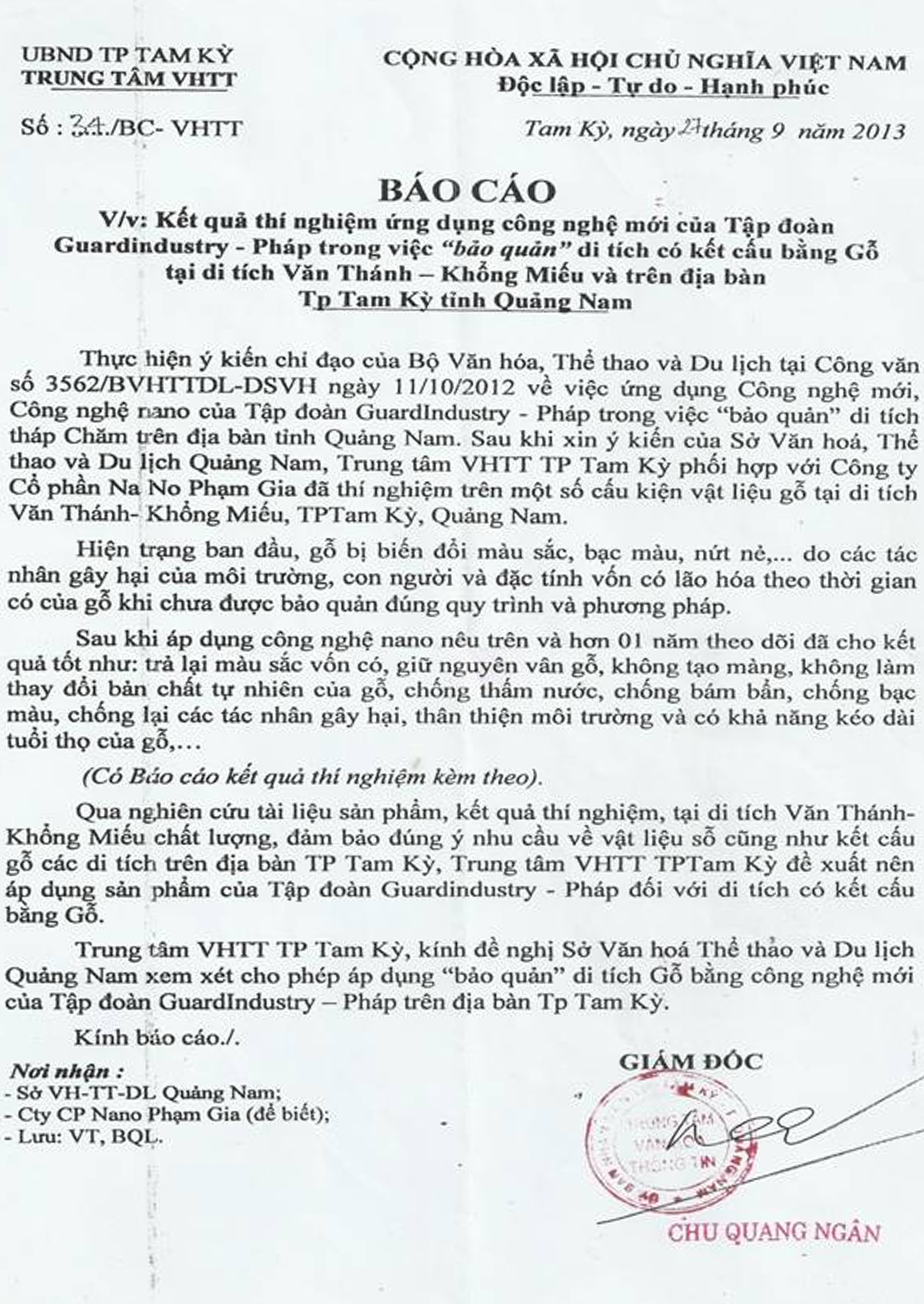 Trung tâm Văn hóa Thể thao Tam Kỳ (Quảng Nam) báo cáo kết quả Ứng dụng Công nghệ Nano, Công nghệ mới của Guard Industrie trong việc “Bảo quản” Gỗ tại di tích Văn Thánh-Khổng miếu