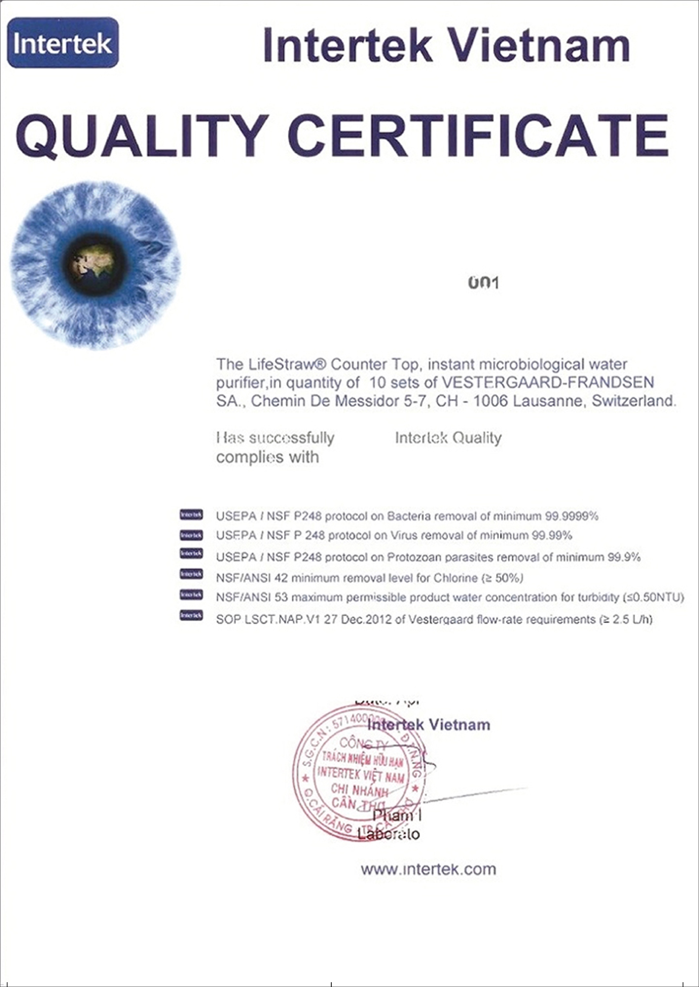 Chứng nhận của Intertek-LifeStraw đạt tiêu chuẩn Nước uống của tổ chức Y Tế Thế Giới (WHO) và USEPA (Hoa Kì)